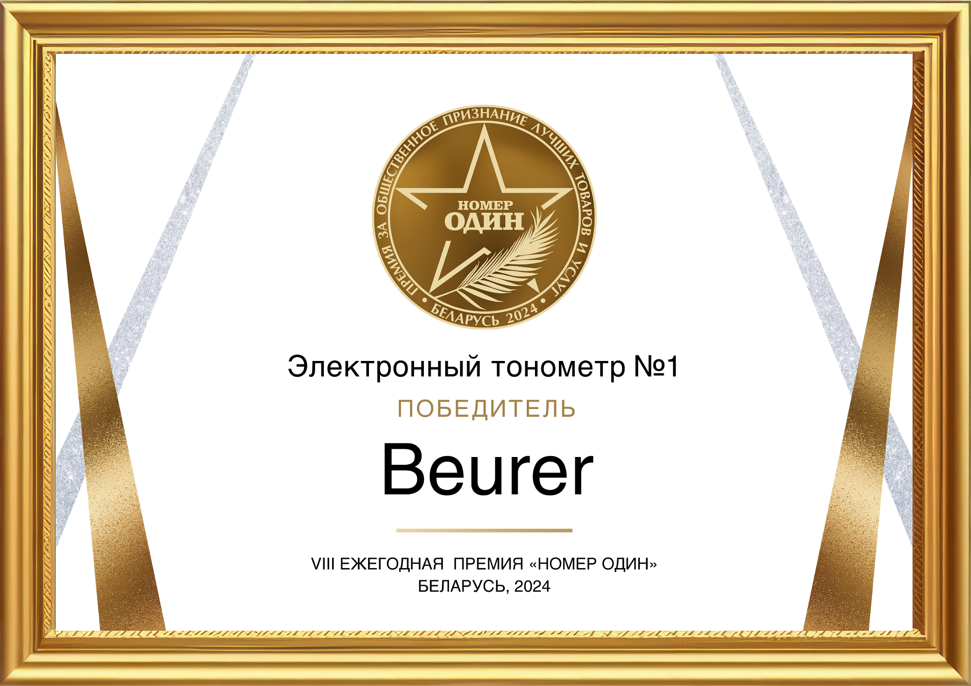 Рады сообщить Вам, что по результатам VIII-ой ежегодной премии «Номер Один», проводимой в Республике Беларусь, на основании оценок потребителей, опытного жюри и оргкомитета бренд «Beurer» одержал победу в категории «Электронный тонометр №1» в 2024 году.