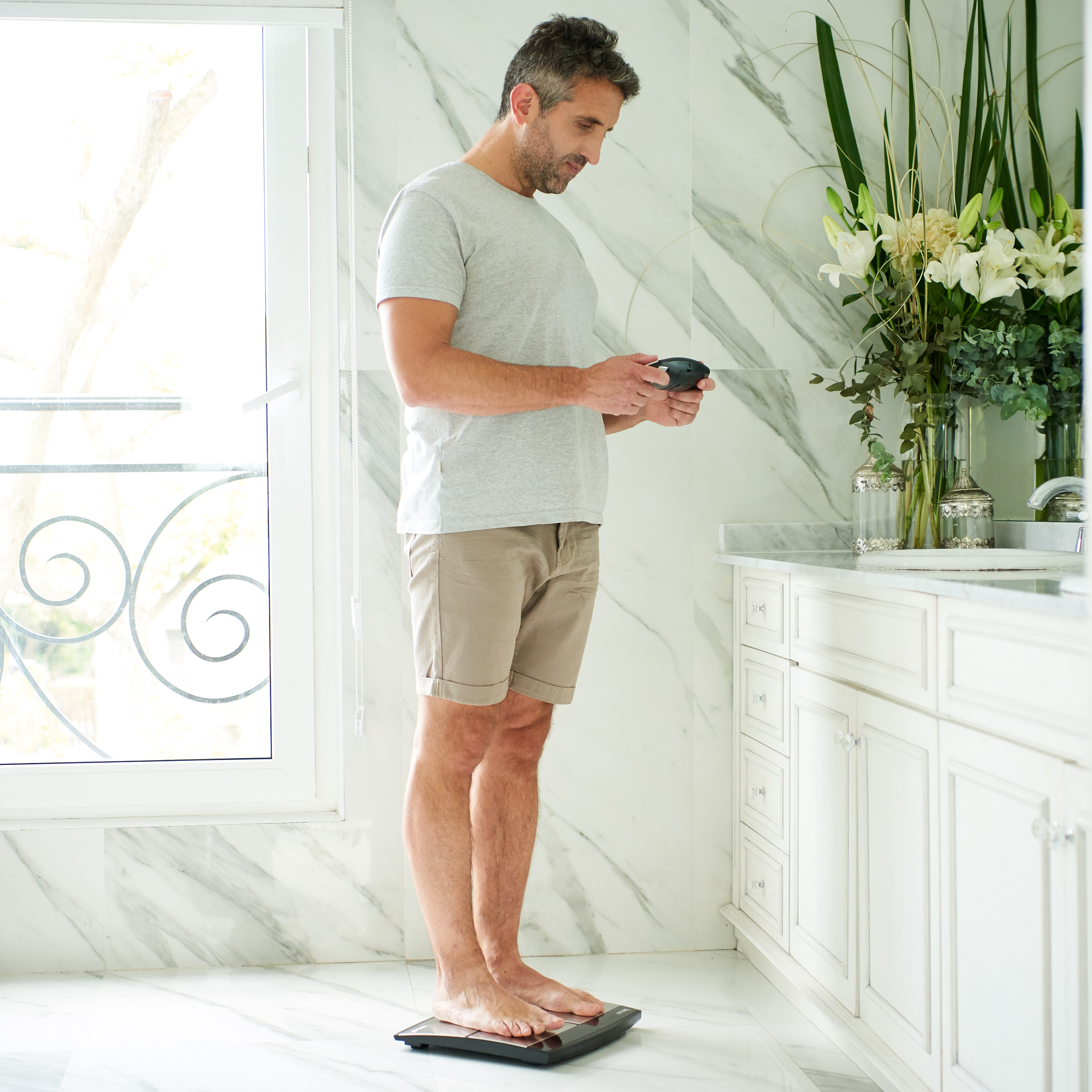 *Весы работают по принципу BIA (биоимпедансометрия): за считанные секунды с помощью незаметного, абсолютно безопасного электрического тока определяется состав тела человека (4 электрода встроены в блок управления с дисплеем и 4 — в весы).
