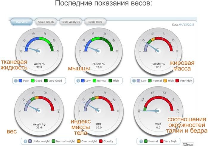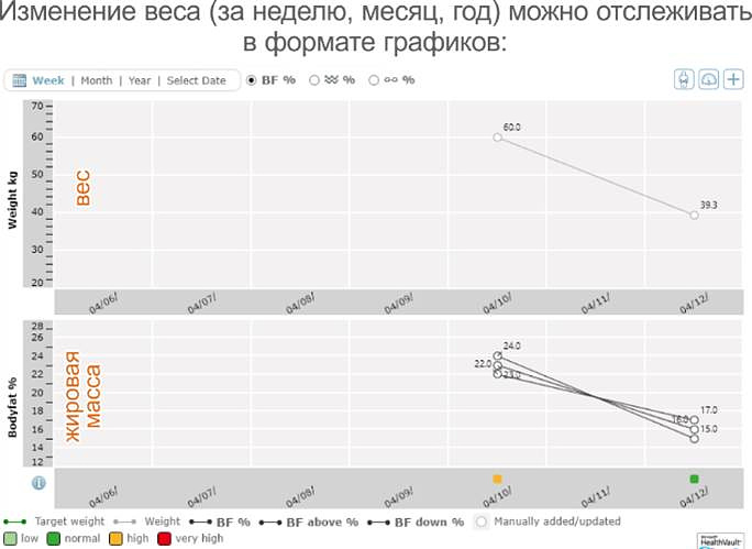 Детализируют данные о весе на: жировую массу, тканевую жидкость, долю мышц, массу костей.