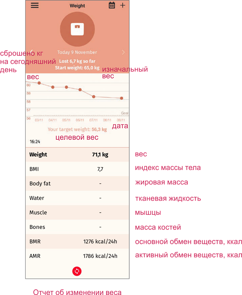 Детализируют данные о весе на: жировую массу, тканевую жидкость, долю мышц, массу костей.