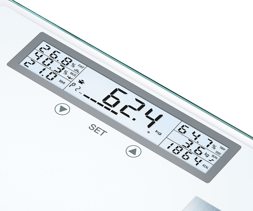 Все результаты измерений: вес, составляющая жировой ткани, составляющая воды, составляющая мышечной массы и масса костей показываются одновременно на уникальном дисплее (производитель позиционирует как XXL).