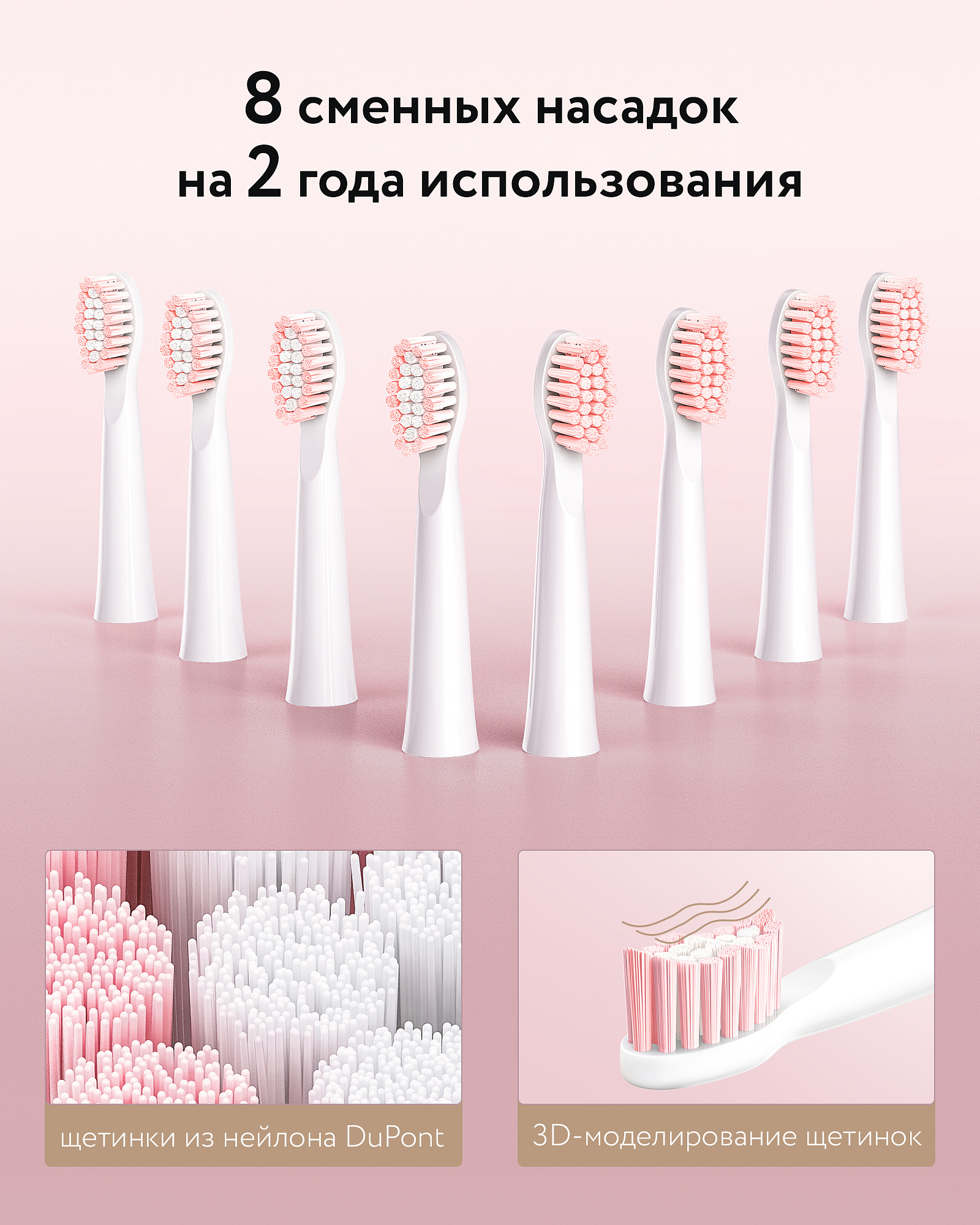 • В комплект включены 8 сменных головок, на протяжении примерно двух лет не придется беспокоиться о том, чтобы купить насадку на электрическую зубную щетку;