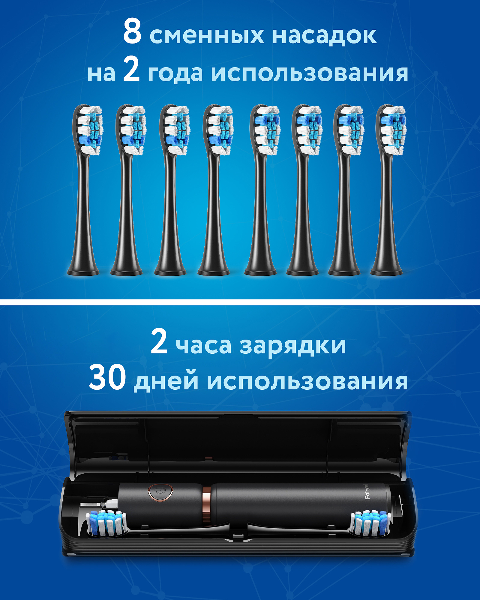 За 62 000 движений щеткой Fairywill P11 превращает зубную пасту в пузырьки для глубокой чистки между зубов. Звуковая зубная щетка очищает в 10 раз эффективнее, чем ручная зубная щетка, и в 3 раза лучше, чем устаревшие электрические зубные щетки.