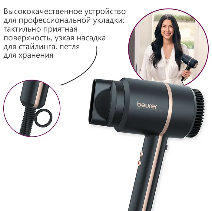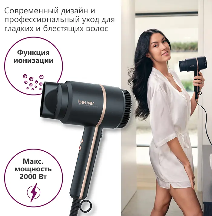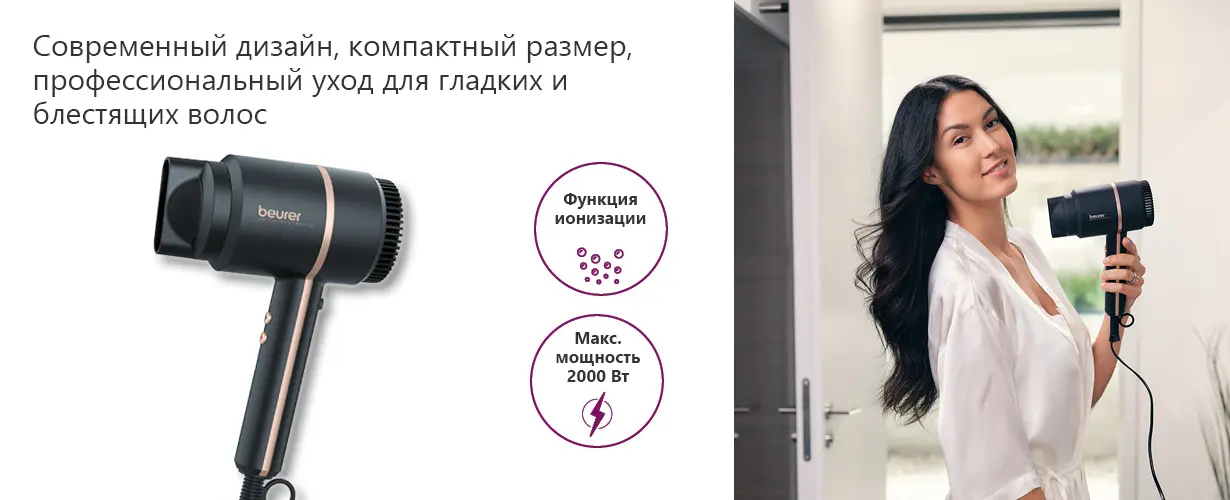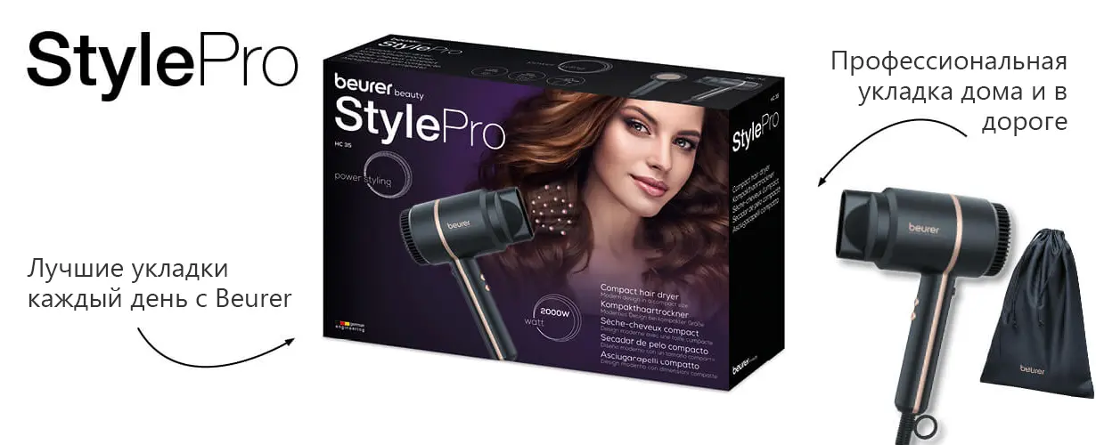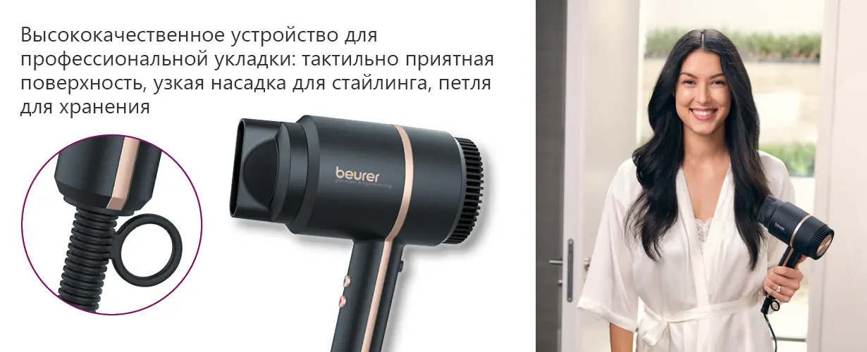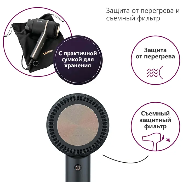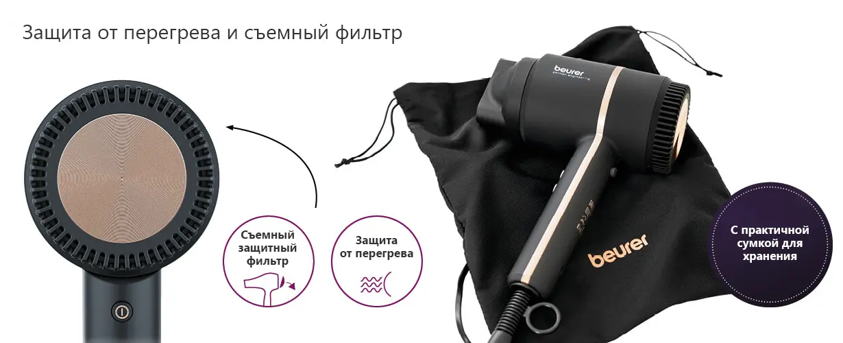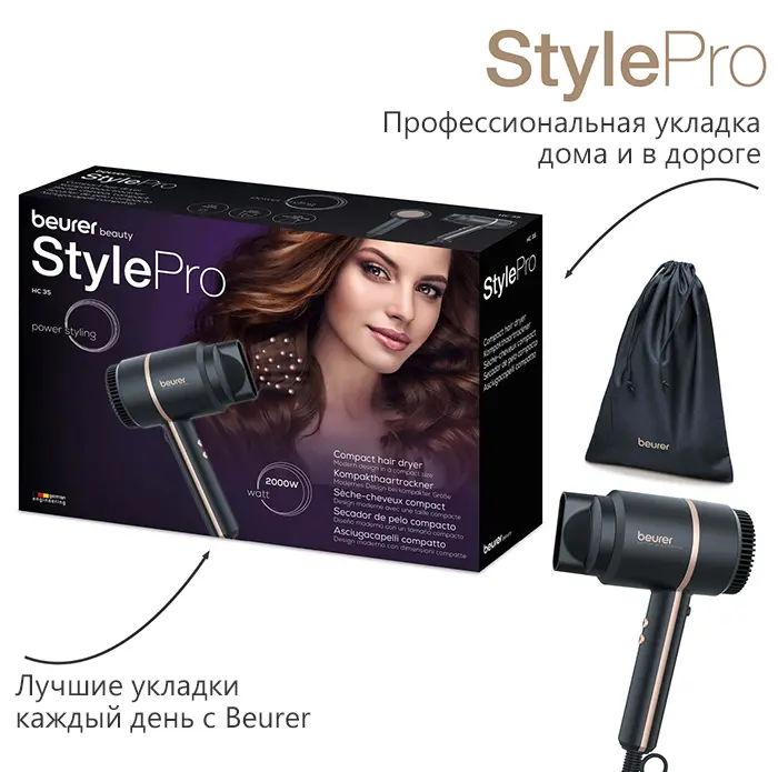 Компактный фен Beurer HC35 впечатляет своим современным дизайном и гарантированно впишется в любую ванную комнату. Благодаря практичной сумке для хранения фен можно быстро уложить в шкаф или дорожную сумку.