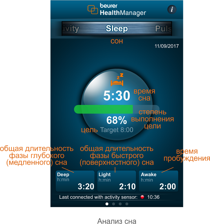С помощью бесплатного приложения beurer HealthManager Ваша вигательная активность будет передаваться с датчика активности на смартфон. Вы в любое время сможете просмотреть всю важную информацию о Вашей активности на смартфоне.