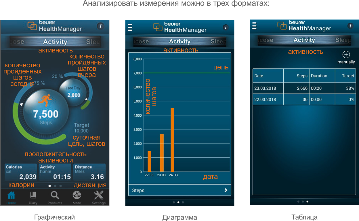 С помощью бесплатного приложения beurer HealthManager Ваша двигательная активность будет передаваться с датчика активности на смартфон. Вы в любое время сможете просмотреть всю важную информацию о Вашей активности на смартфоне. Кроме того, Вы сможете получать уведомления о полученных сообщениях (СМС, WhatsApp, Facebook Messenger) или звонках.Язык интерфейса - русский.