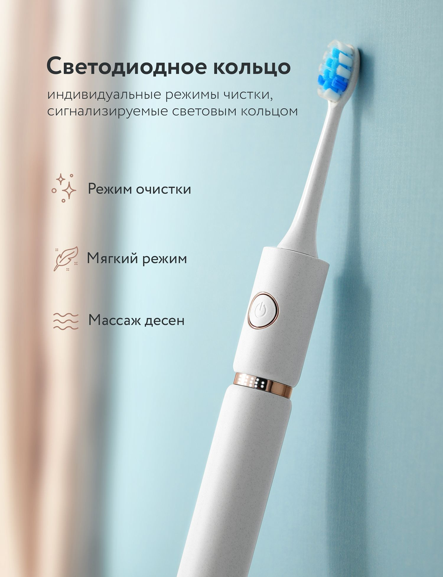 Электрическая зубная щетка Fairywill P11 прекрасно сочетает в себе стильный внешний вид и надежную функциональность. Золотое кольцо - это не только оригинальный дизайн, но и индикатор режимов чистки: Чистый, Мягкий, Массаж. Fairywill P11 позаботится о ваших личных потребностях в чистке.