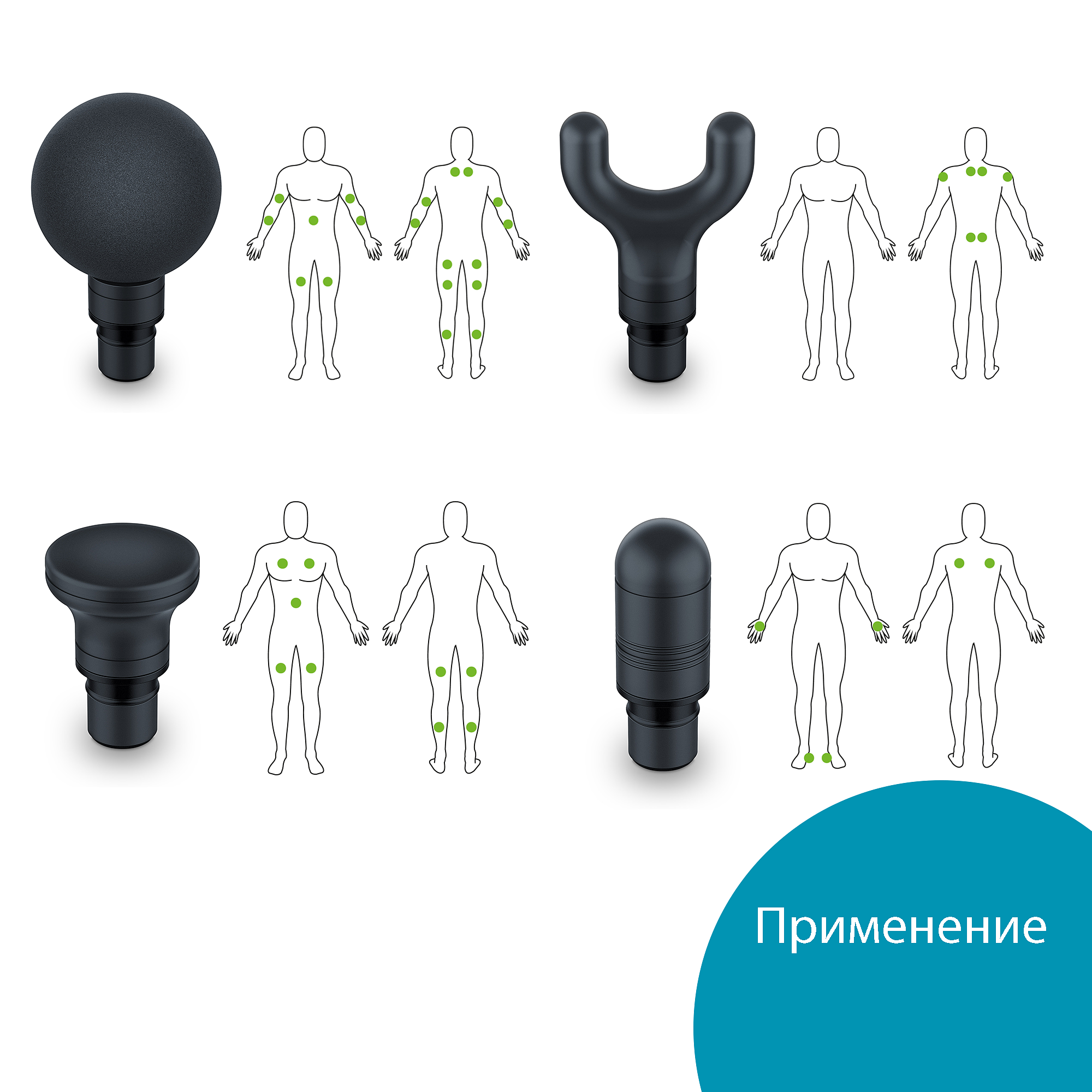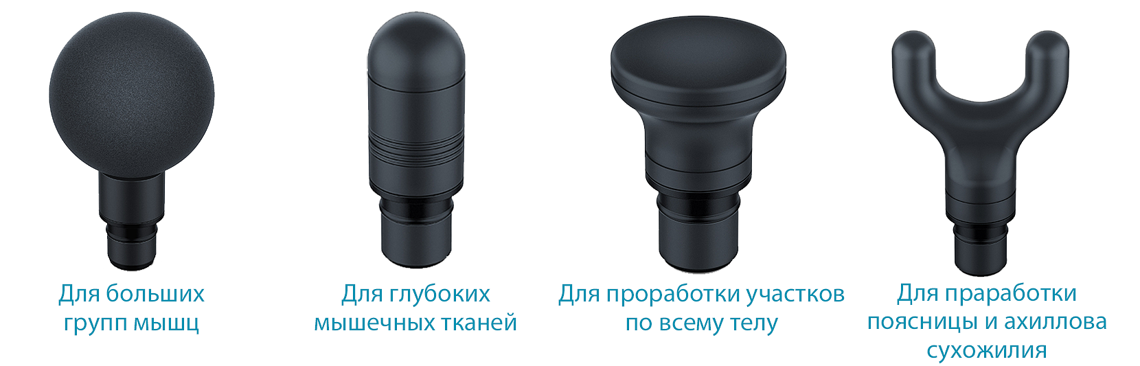 В комплект поставки входит 4 насадки, каждая из которых позволяет облегчить использование и увеличить эффективность воздействия перкуссионного массажа для разных частей тела: