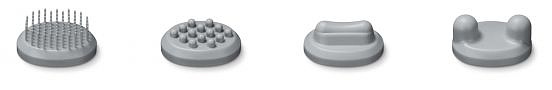 В комплект поставки входят 4 насадки: 2«узелковые» насадки - для интенсивного и точечного глубокого массажа, насадка-щетка - для интенсивного массажа кожи, действует приятно и улучшает кровообращение, конусная насадка - для интенсивного и глубокого точечного массажа.