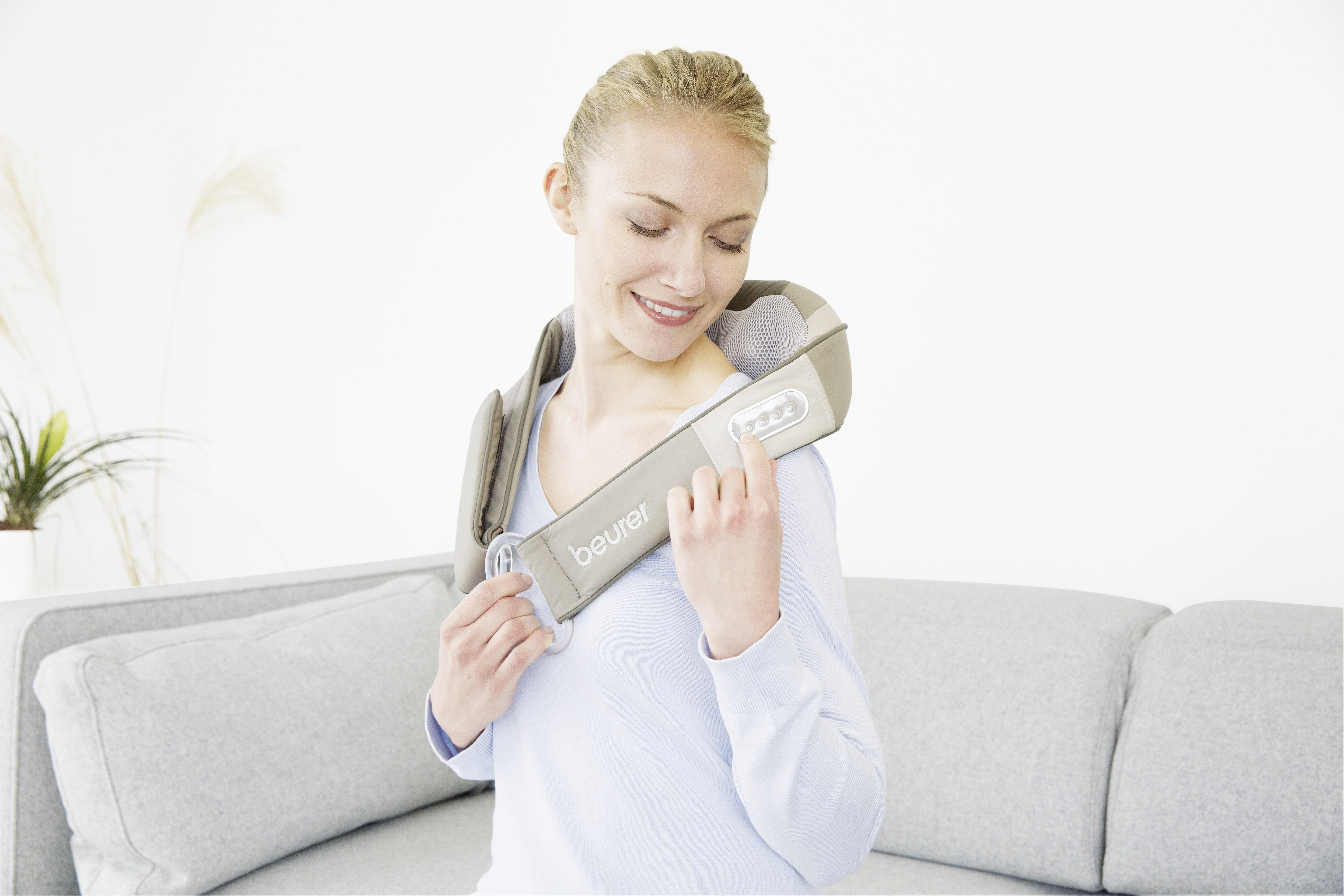 Легкость использования достигается с помощью встроенного в прибор элемента управления. Благодаря практичным ручкам возможно целенаправленное применение массажа в тяжело доступных участках шейно-плечевого отдела.