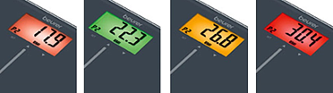 Интерпретация ИМТ на цветном дисплее (согласно ВОЗ*). Индекс массы тела высчитывается, исходя из вводимого показателя роста тела и веса, определяемого прибором.