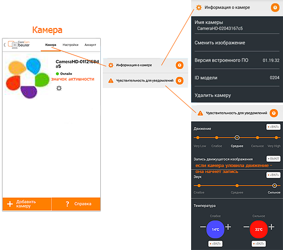 Изделие оснащено удобной функцией Push-уведомления при движении, шуме, изменении температуры.