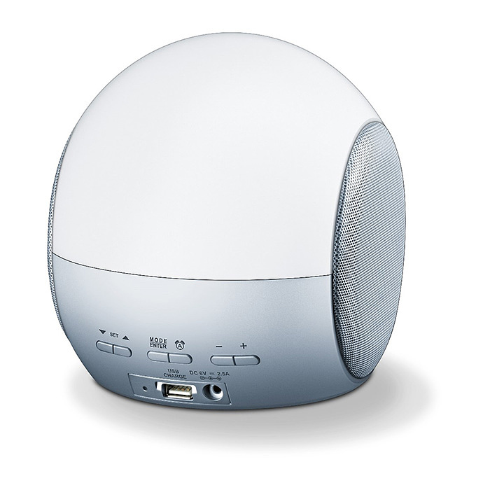Постепенно уменьшающаяся интенсивность светодиодного освещения имитирует закат солнца. Это значит, что через установленное время (2 – 60 минут) яркость света начнет уменьшаться. А функция "спокойной ночи" обеспечит еще более комфортное засыпание под радио.
