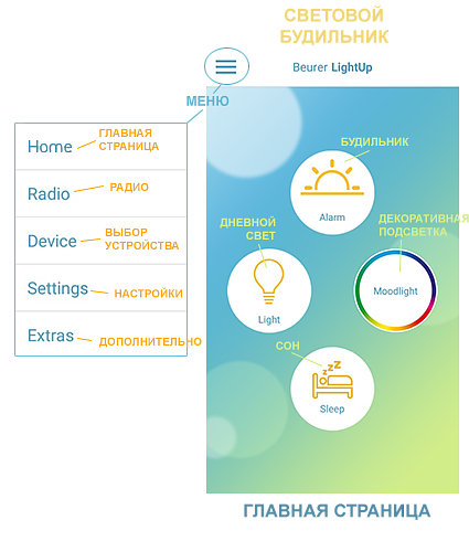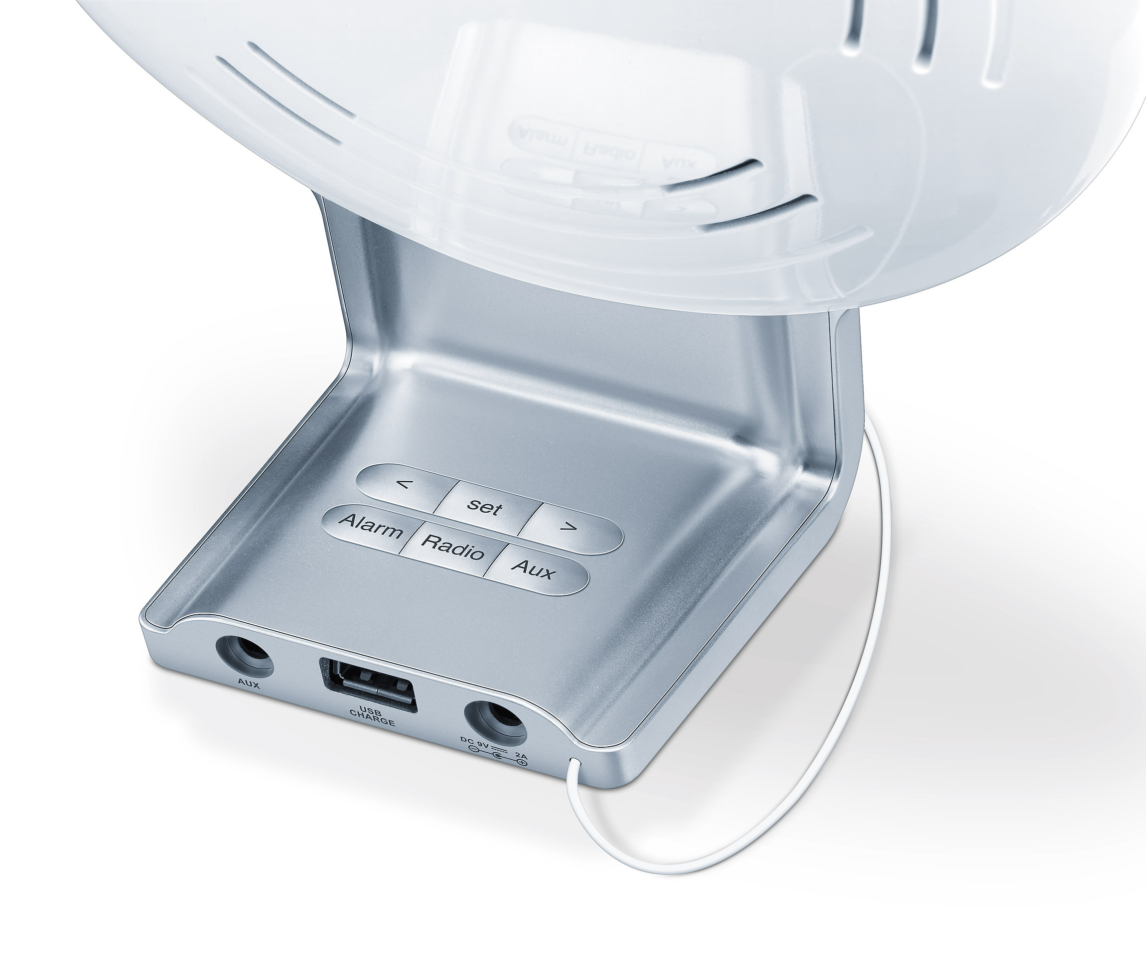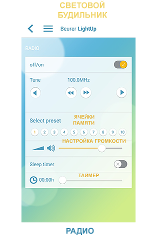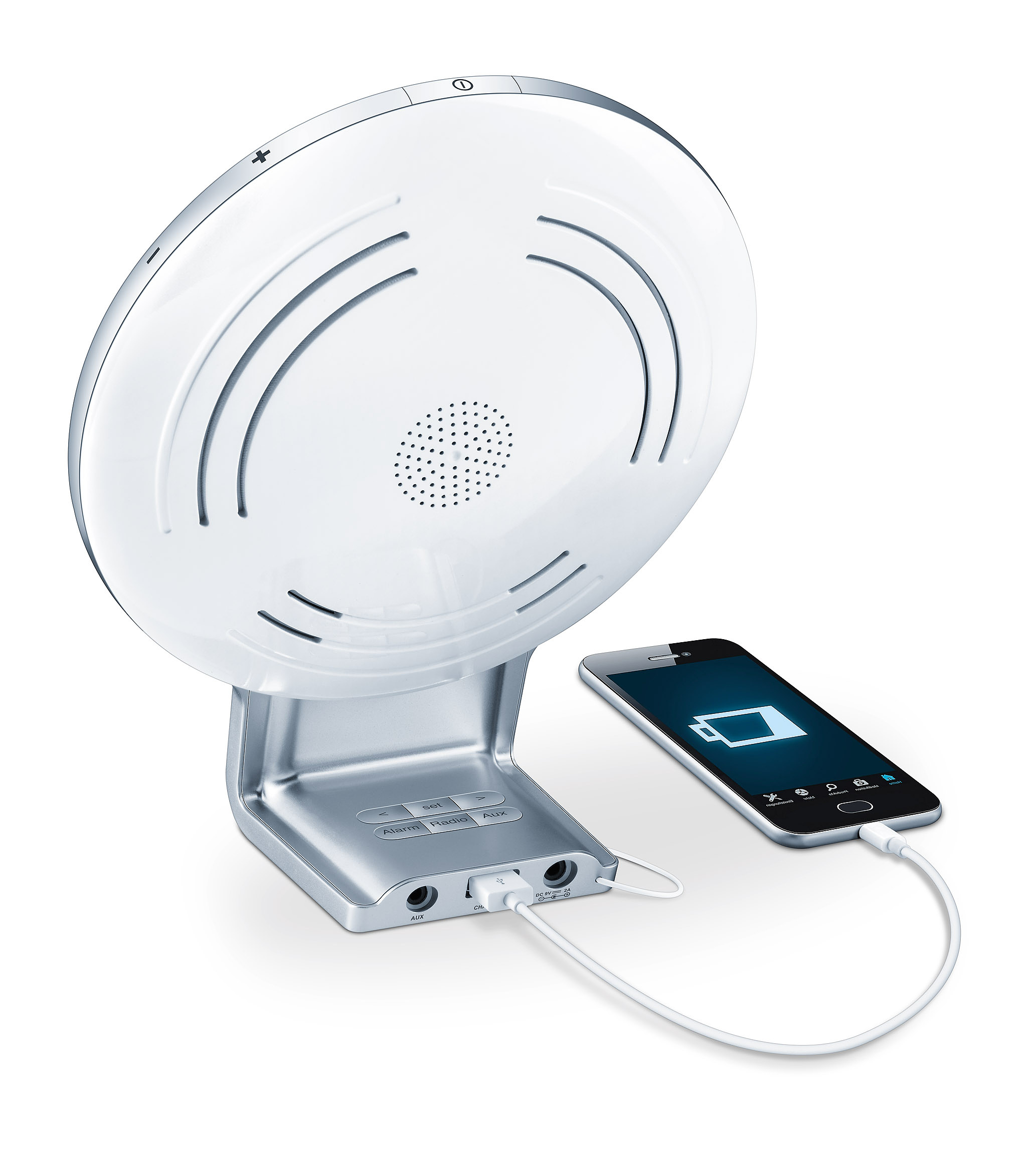 Световой будильник WL75 совмещает в себе функции радио, светильника, ночника, настольной лампы и даже колонок для прослушивания музыки. Кроме того, вы сможете подключить будильник к бесплатному приложению Beurer LightUp (язык интерфейса - английский), которое позволит Вам дистанционно управлять прибором и расширит функциональные возможности.
