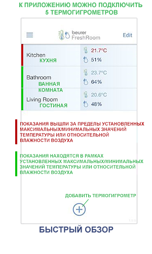 Многокомнатная индикация: при помощи приложения можно подключить и управлять одновременно 5 термогигрометроми и дать им разные наименования(например, «кухня» или «гостиная»).