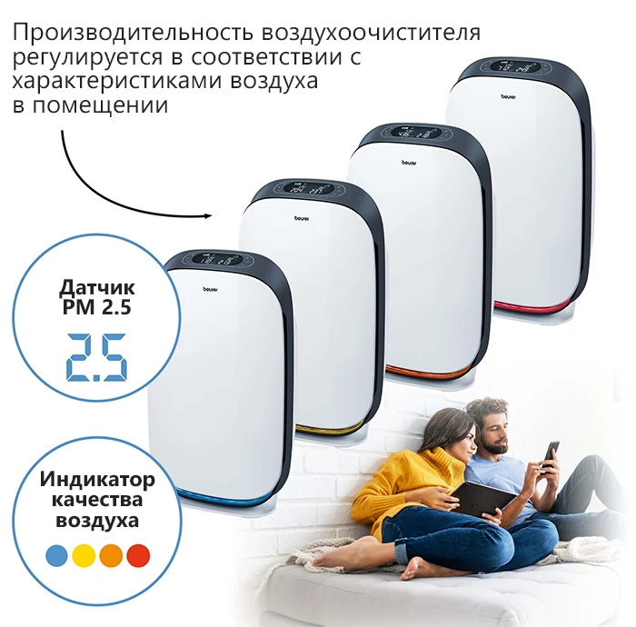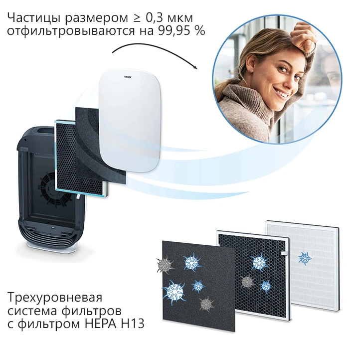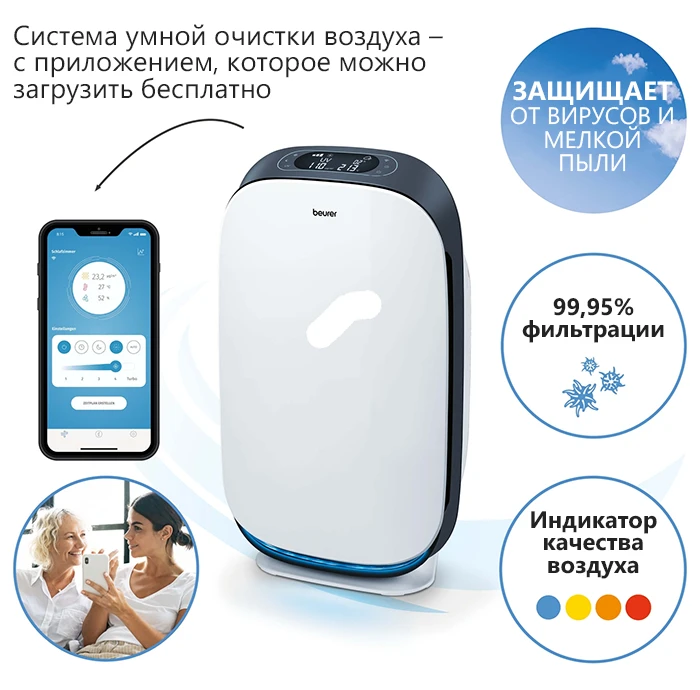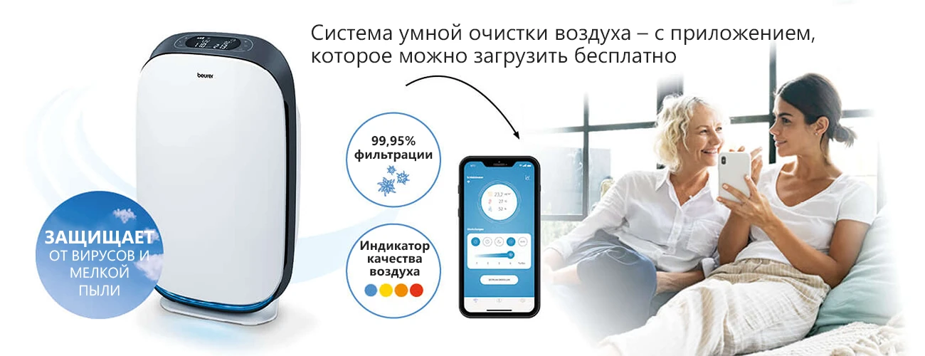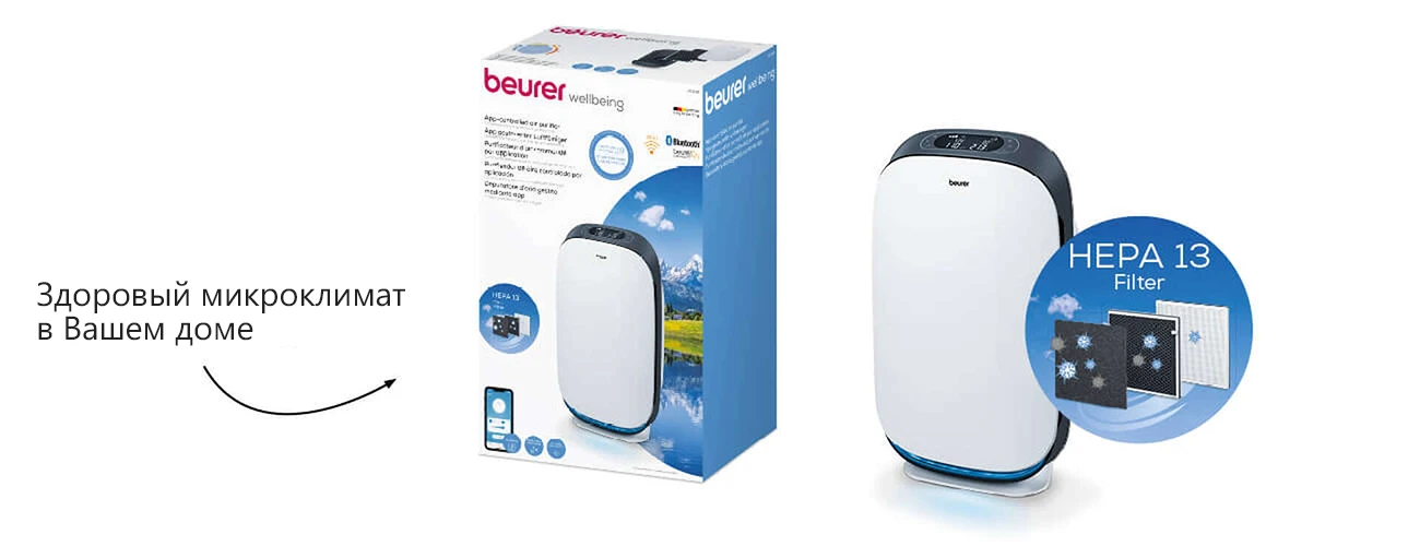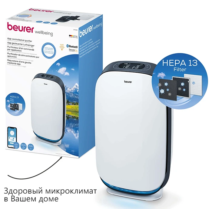 Beurer LR 500 – первый очиститель воздуха, контролируемый мобильным приложением Beurer FreshHome. Оно позволяет легко контролировать качество воздуха в помещении благодаря соединению устройства по Wi-Fi. Аппарат очищает воздух от внутренней пыли, волос животных, запахов, пыльцы, различных бактерий и вирусов, а также вредных газов, которые могут послужить возникновению аллергий и других заболеваний. Очиститель имеет трехслойную систему фильтров, один из которых HEPA 13, способный убирать 99,95% всех вредных частиц.