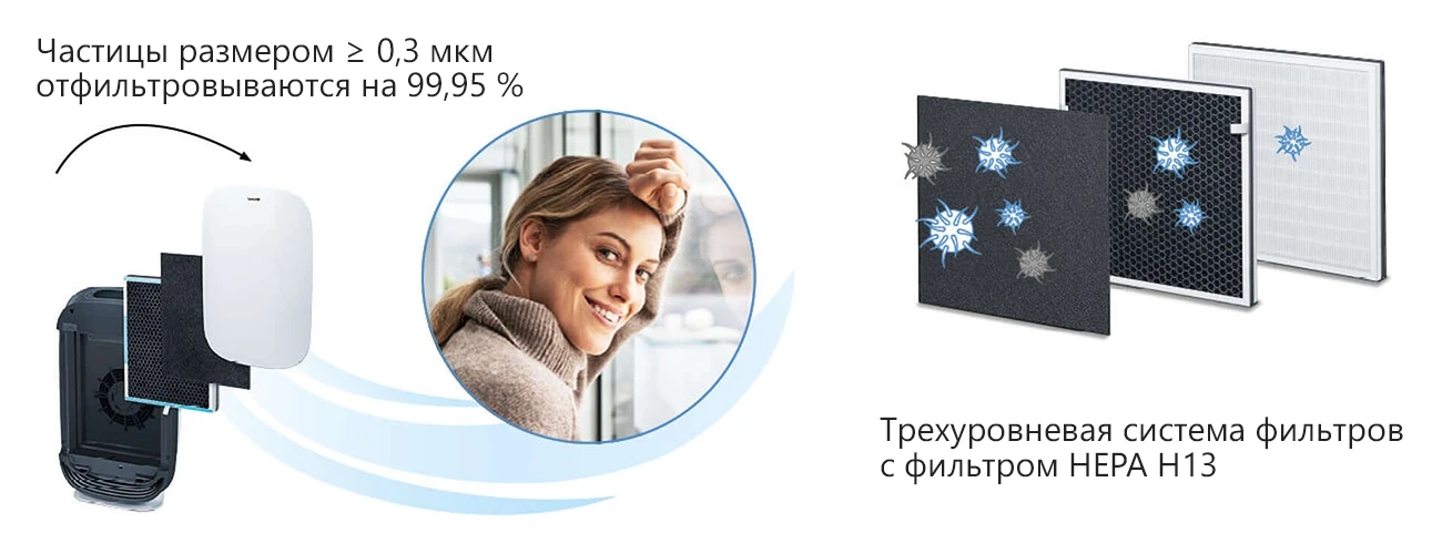 Очистка воздуха осуществляется трехслойной фильтрующей системой. Удаляет бактерии, устраняет сухость и придаёт свежий запах при помощи фильтра с активированным углем (для нейтрализации неприятных запахов), HEPA-фильтра E13 (отфильтровывает бактерии, вирусы, пыльцу), фильтра грубой очистки (убирает большие частицы пыли и волоски).
