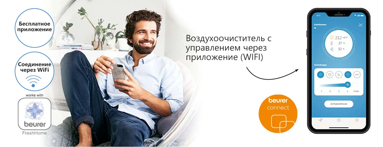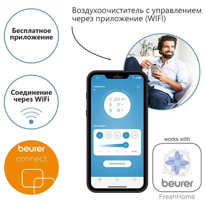 В приложении Beurer FreshHome по Wi-Fi доступны контроль и оценка качества воздуха, обзор всех подключенных приборов для долговременного анализа воздуха в помещении, сообщение при значениях, выходящих за пределы определенного индивидуально диапазона, советы по улучшению микроклимата.